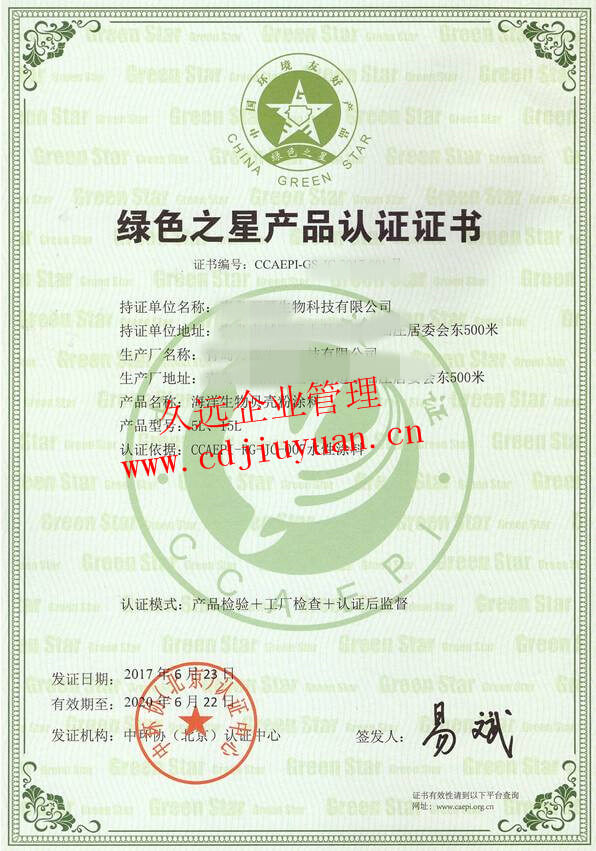 綠色之星產(chǎn)品認(rèn)證證書(shū)