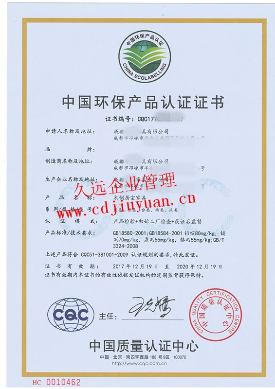 家具有害物質(zhì)限量認(rèn)證證書(shū)